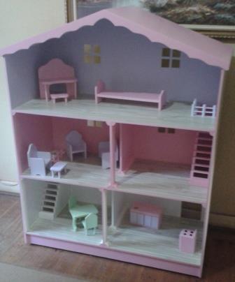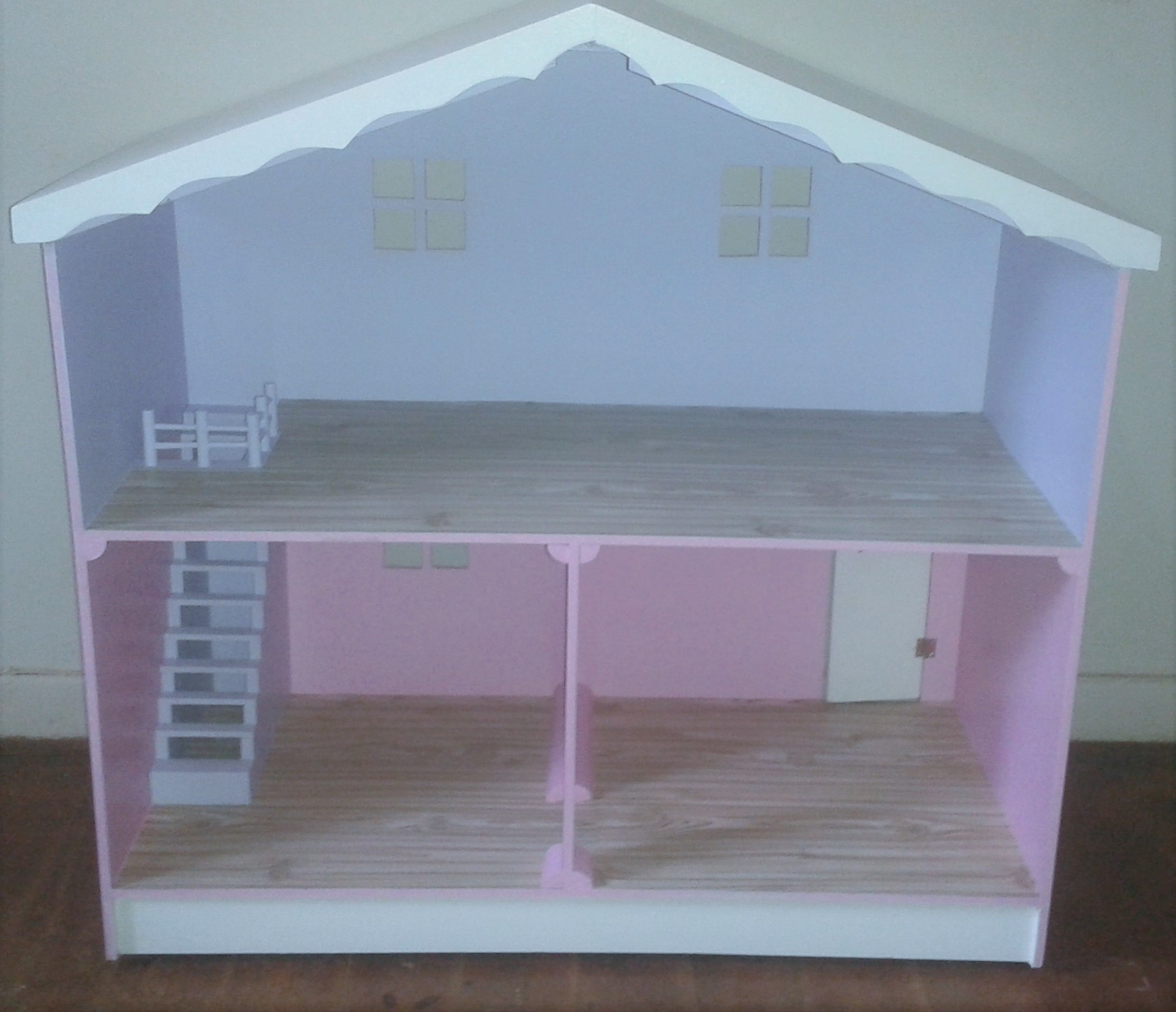 All our barbie houses can be painted in any of our colours. the large house is 1,3 m high and the smaller house is 1 m high. They are all on castor wheels, furniture is only available with the house . All houses are the same as the first picture on the reverse side. We were also asked to make a single level house, I have included a picture here.